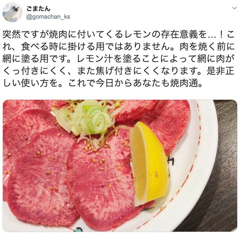 飯 【画像】焼肉通「焼肉についてるレモンは肉にかける為ではありません、網に塗るものです」